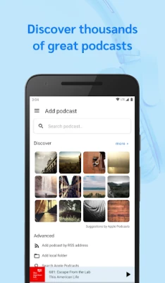 AntennaPod is a podcast manager and player that gives you instant access to millions of free and paid podcasts, from independent podcasters to large publishing houses such as the BBC, NPR and CNN. Add, import and export their feeds hassle-free using the Apple Podcasts database, OPML files or simple RSS URLs.
