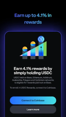 *USDC Rewards are offered at Coinbase’s discretion. You can opt out at any time. The rewards rate is subject to change and can vary by region. Customers will be able to see the latest applicable rates directly within their wallets if eligible.