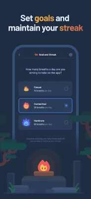 Goals & Streaks: Set your breathing goals—casual, committed, or hardcore—and keep the flame mascot alive by maintaining your streak.
