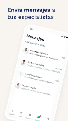 ★ Envía mensajes a tus especialistas. ¿Tienes dudas antes de tu cita? ¿Alguna pregunta relacionada con la visita que has tenido con un médico? Con la app, podrás contactar de forma directa con tus especialistas médicos desde la sección "Mensajes" para resolver tus dudas antes o después de tu visita.