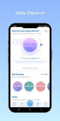 Features include a daily check-in, goal setting, coping statements, relaxation exercises, and a Community Forum for peer support.