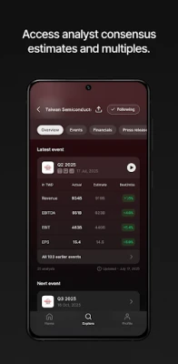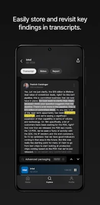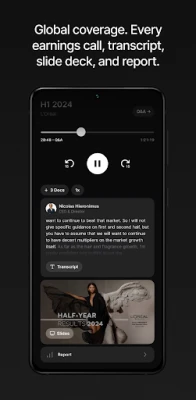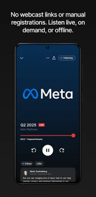 The #1 app for live earnings calls, transcripts, analyst estimates, and more. All for free. Follow the companies that matter to you. Get a personalized feed with real-time updates. No more hunting for webcast links or registering for events manually. Just click and listen.